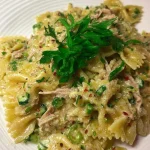 Farfalle mit Zucchini-Sahne und Thunfisch auf einem Teller serviert