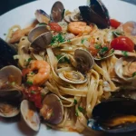Fettucce mit Kirschtomaten, Garnelen, Muscheln und Venusmuscheln