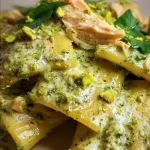 Manchmal sind es die einfachen, heimeligen Gerichte, die mir am meisten bedeuten — wie dieses Paccheri mit Lachs, Creme und Pistazienpesto, das meine Küche an einem regnerischen Sonntag in einen kleinen Zufluchtsort verwandelte. Der Duft von Butter und Zitrone, das sanfte Brutzeln vom Lachs und das nussige Aroma des Pistazienpestos — sofort fühlt es sich wie Umarmung auf dem Teller an. Wenn du Lust auf eine cremige Pasta hast, die trotzdem leicht und frisch bleibt, ist dieses Paccheri mit Lachs genau das Richtige.
