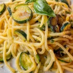 - Die Kombination aus al dente Spaghetti, leicht gebräunten Zucchinischeiben und Pecorino ergibt eine überraschend cremige Textur (ganz ohne schwere Sahne).