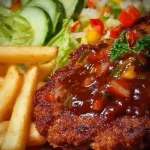 Vielseitig und anpassbar – Das Gericht kommt mit einem frischen Salat und knusprigen Pommes, die es zu einer kompletten Mahlzeit machen. Du kannst die Beilagen ganz nach deinem Geschmack variieren.
